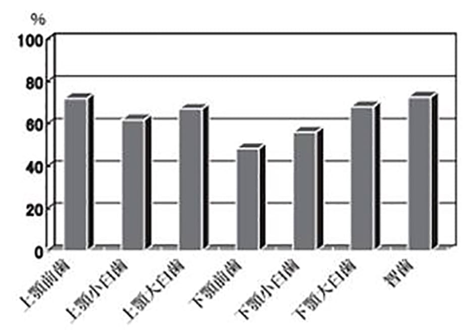 東京医科歯科大むし歯外来に初診来院した患者で、根管処置後のレントゲン写真上で根管治療の失敗を認めた歯の割合を表しています。