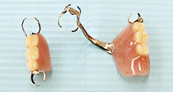 写真の金属の棒の部分のレバーが動くようになっていて、閉じると入れ歯が固定されます。(写真は左下大臼歯を二本欠損している例です)