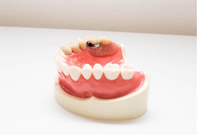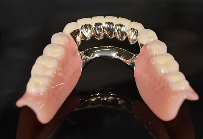| リーゲルテレスコープ義歯(本体) | ¥1,100,000~ | 歯周病などで不安のある歯も連結固定したうえで、レバーでカギをかける義歯。審美的で残存歯を長持ちさせる。 |