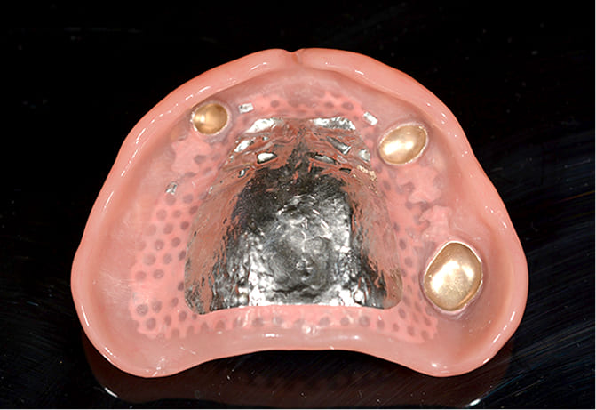 レジリエンツテレスコープは、片顎で残っている歯が4本以内の場合に適用されます。入れ歯の形は総入れ歯とほぼ同じ形態ですが、最大の特徴は残っている歯に負担がかからないことです。